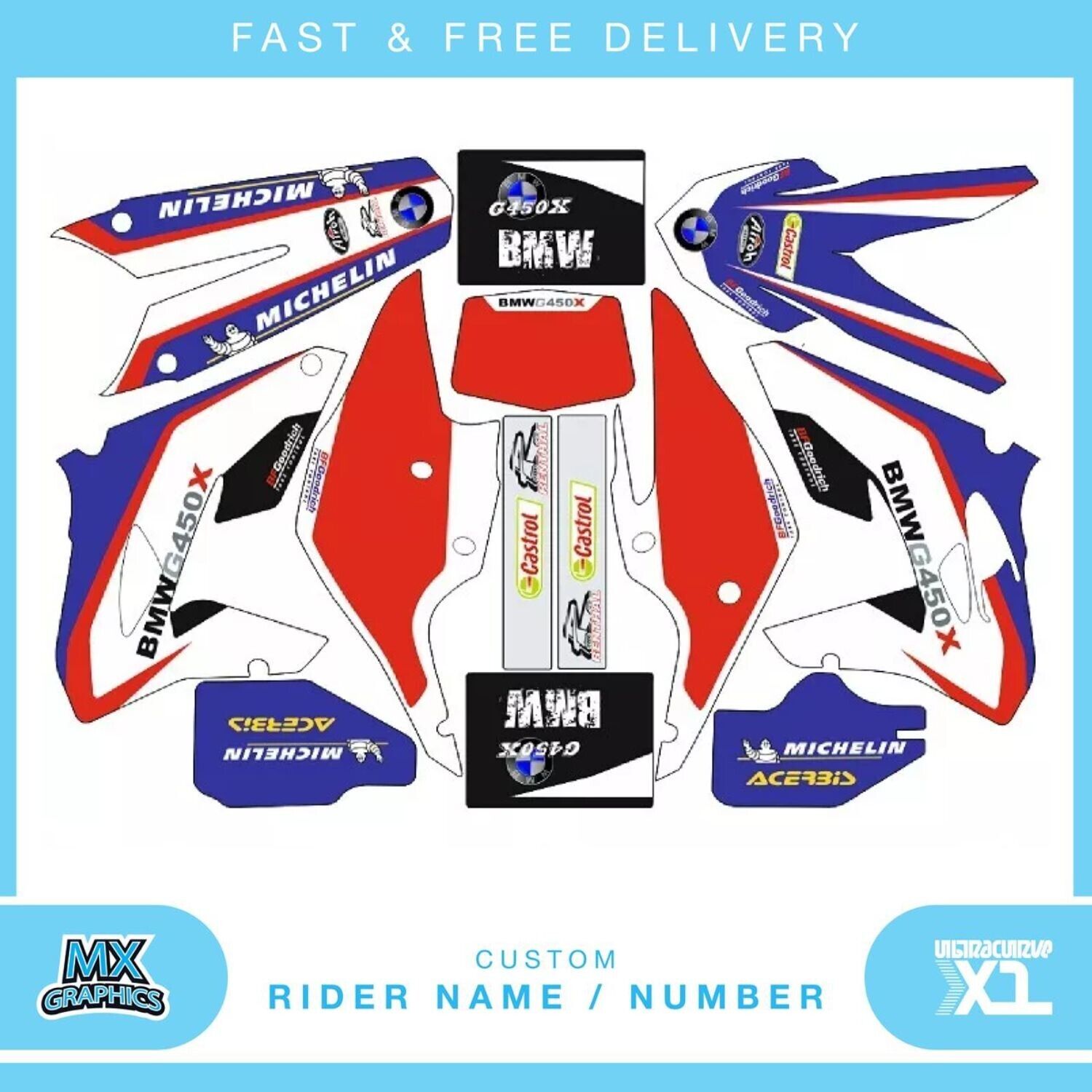 This custom decal kit is perfect for any motocross enthusiast looking to add a personal touch to their BMW G450X motorcycle 2010-2011. The colourful design and custom text feature make it a unique addition to any bike. This kit can be placed on various parts of the motorcycle, including the side, upper, lower, rear, front, right, left, and fuel tank. It is made of high-quality vinyl and is suitable for any motorcycle.